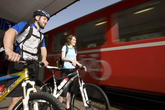 Der Bahnhof Chur ist sowohl eine wichtige Station der Schweizerischen Bundesbahn und Haltestelle der wichtigsten internationalen Bahnlinien aus Deutschland und den Benelux-Ländern, als auch der Hauptbahnhof der Rhätischen Bahn. Mit der zusätzlichen grossen Postauto-Station am gleichen Ort verkehren ab Chur Züge und Postautos im Minutentakt in alle Richtungen. Und der Transport von Fahrrädern ist sowohl mit der Bahn als auch mit den Postautos problemlos möglich.