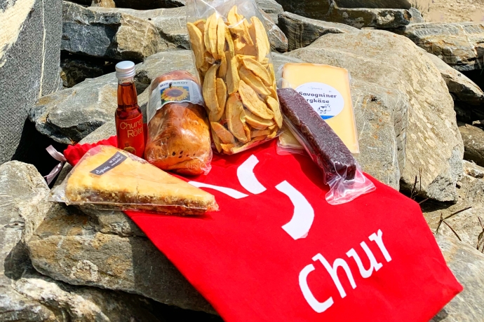 - Churer Picknick Säckli mit ausgesuchten Bündner Spezialitäten (kleines Birnbrot, Stück Churer Alpkäse, Fitness-Salsiz aus Rindfleisch, Apfelschnitze, Nusstortenstück, Portionen-Fläschchen Churer Röteli), alle Produkte aus regionaler Produktion der Hosang'schen Stiftung Plankis, Röteli von www.roeteli.com.